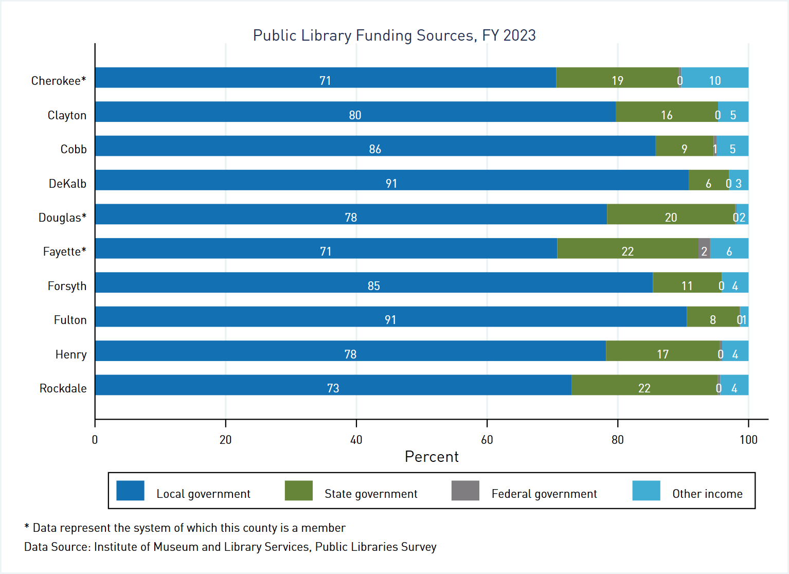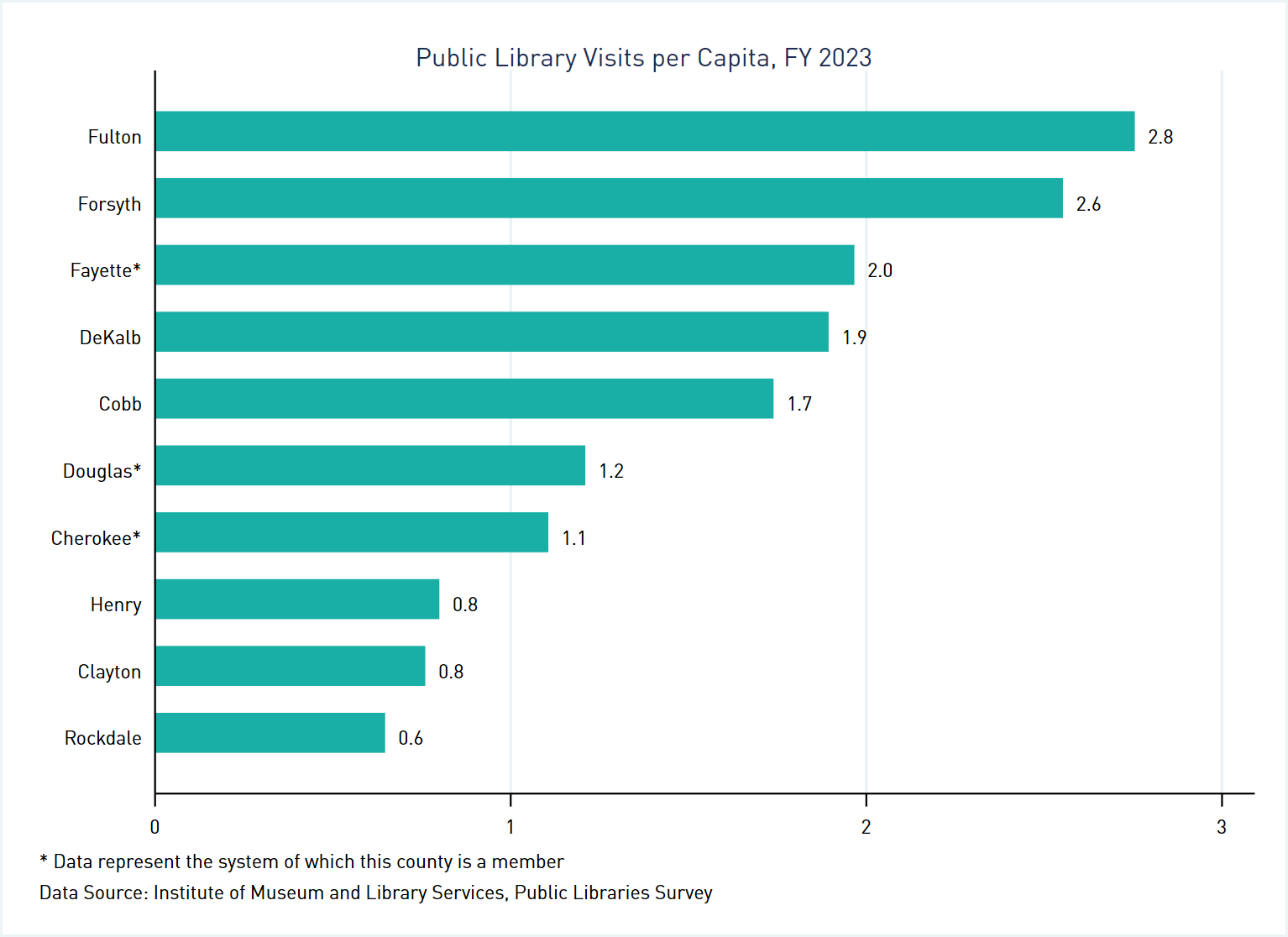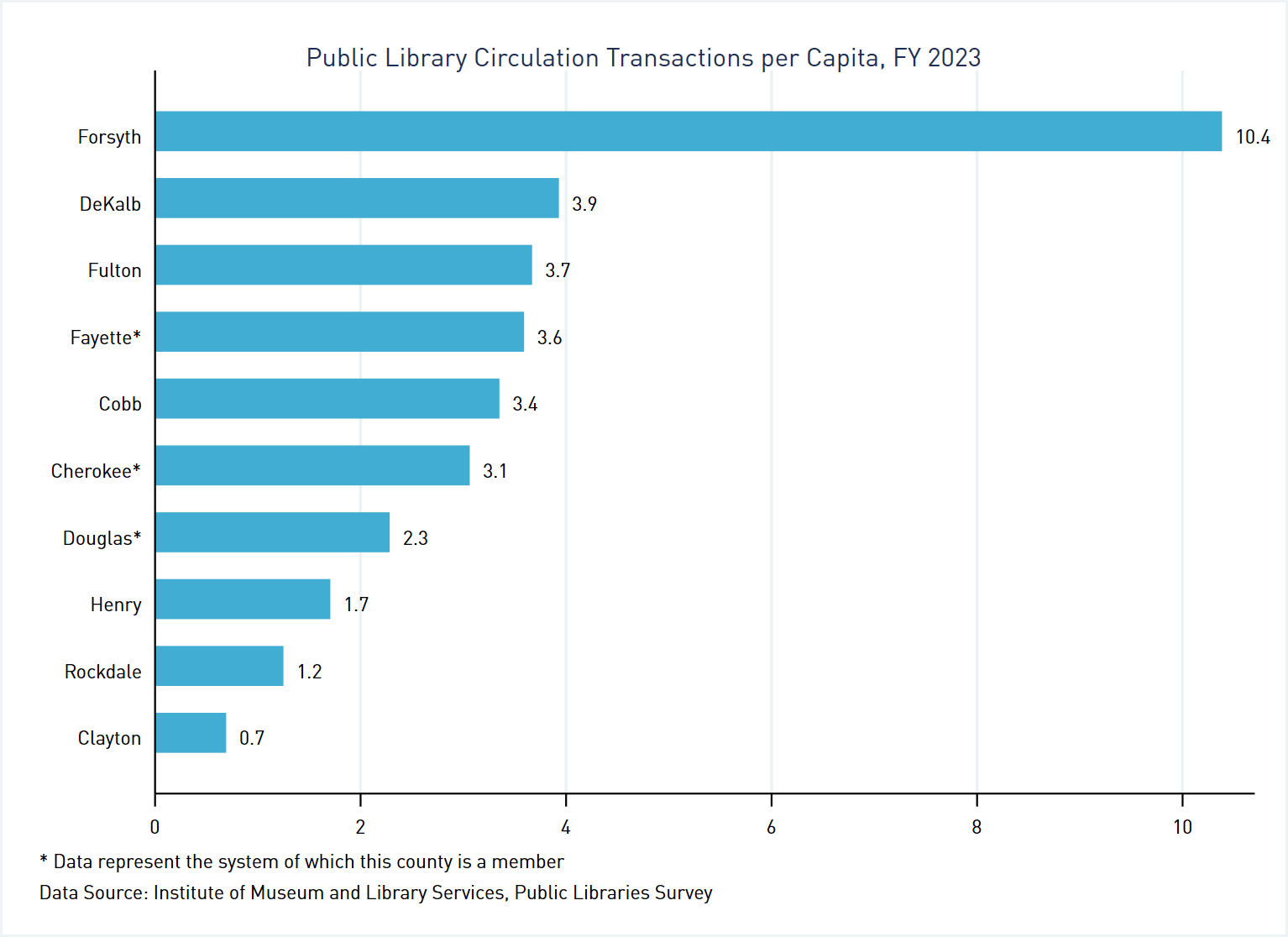A note before presenting data at the system level: Georgia has 159 counties but only 60 library systems. This means that some counties belong to the same system. Within our region, this is true, respectively, for Cherokee County[4], Douglas County[5], and Fayette County.[6] The IMLS survey reports data by system and not by county, so the graphs presenting data for these three counties represent the entire systems to which those counties belong.[7]