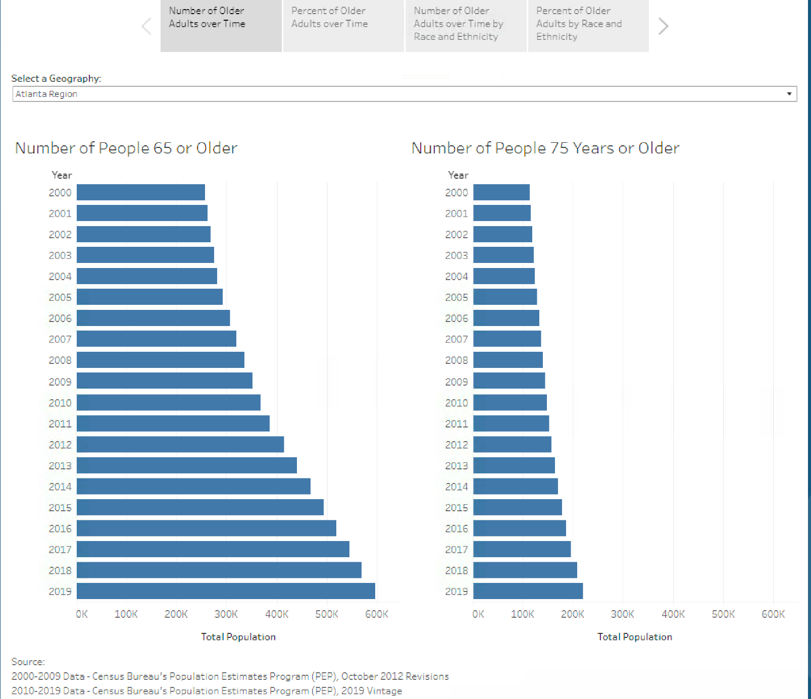 Introducing a new dashboard that visualizes change (total and by race/ ethnicity) over the last 20 years for regional and county 65+ and 75+ populations.