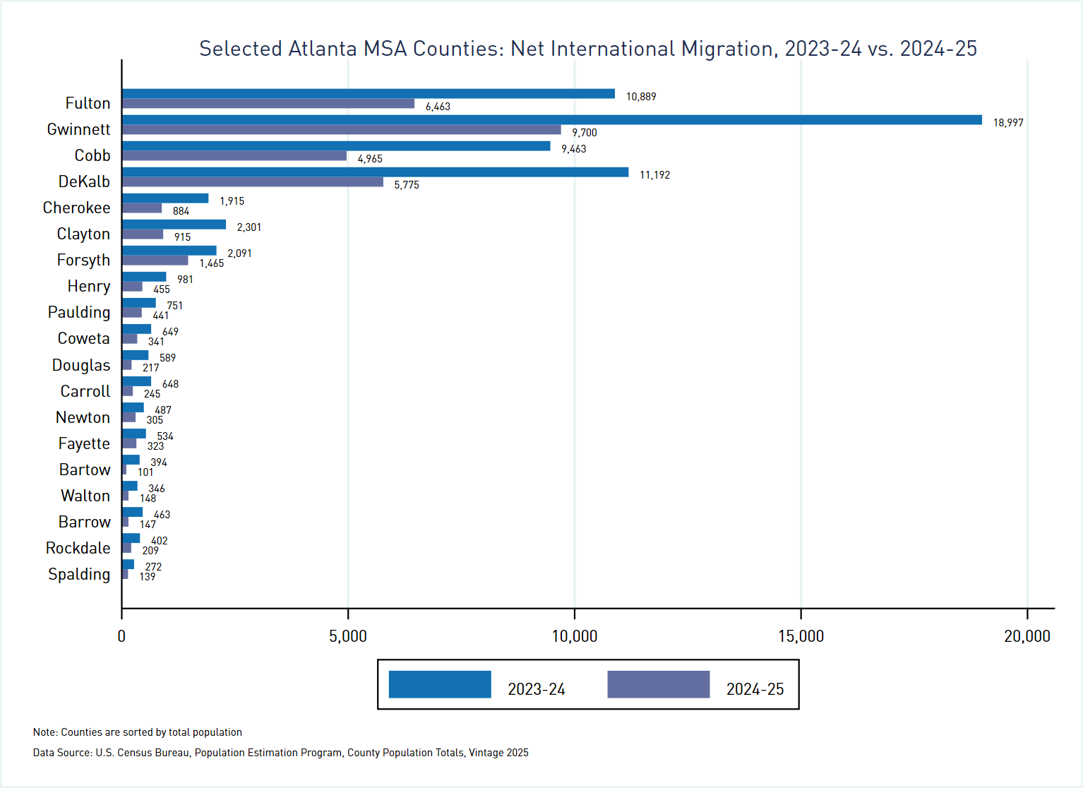 As we noted when discussing components of change among major metros, changes in national immigration policy have resulted in sharp drops in international migration nationwide. How does that look among counties in metro Atlanta? Figure 4 compares net international migration between the 2023-24 and the 2024-25 periods; for the sake of legibility, this graph is limited to the nineteen counties that had gained at least 100 people via international migration in the 2023-24 period: