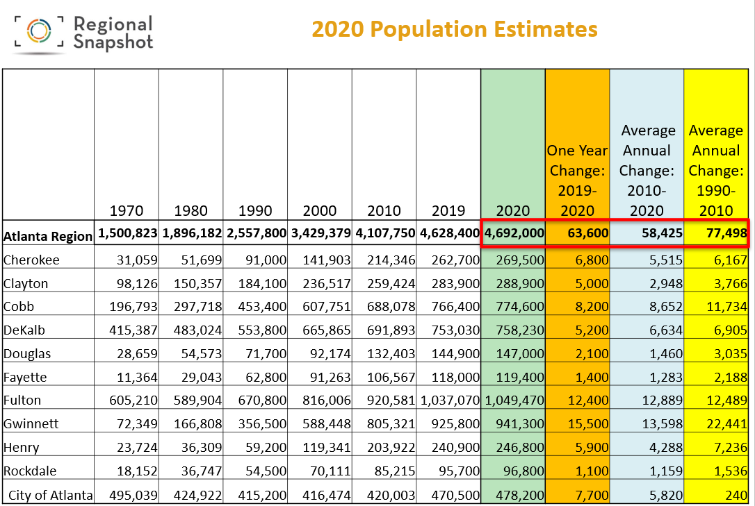 ARC's 2020 major jurisdiction population estimates. The 10-county region’s population increased by 1.2 percent and now stands at 4,692,000 — more than that of 24 states. A significant reduction in job growth has resulted in slowing of the region’s population growth, to the lowest level of the last four years.